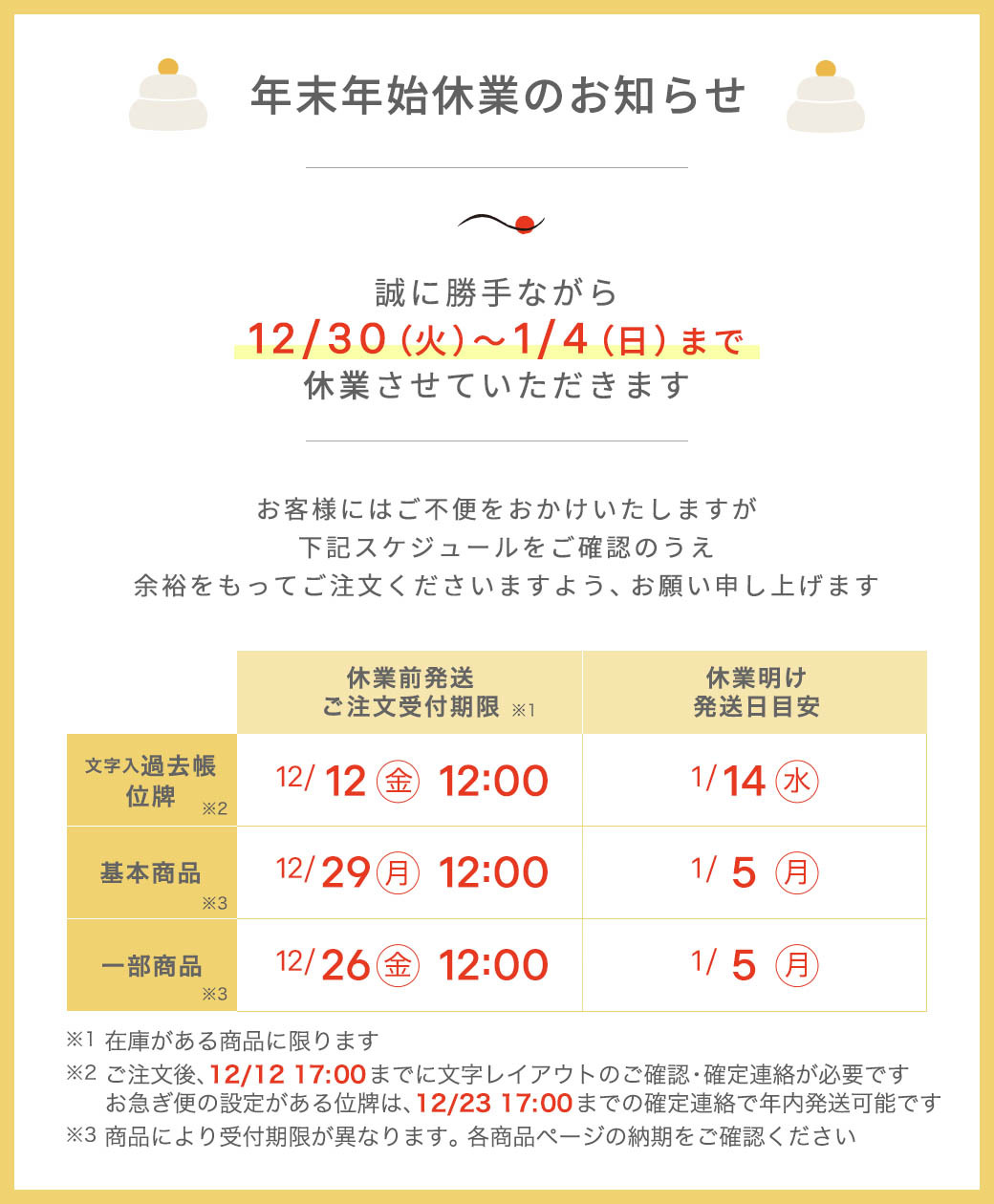 ※商品によって休業前発送期限が異なります。詳しくはこちらのURLよりご確認ください。